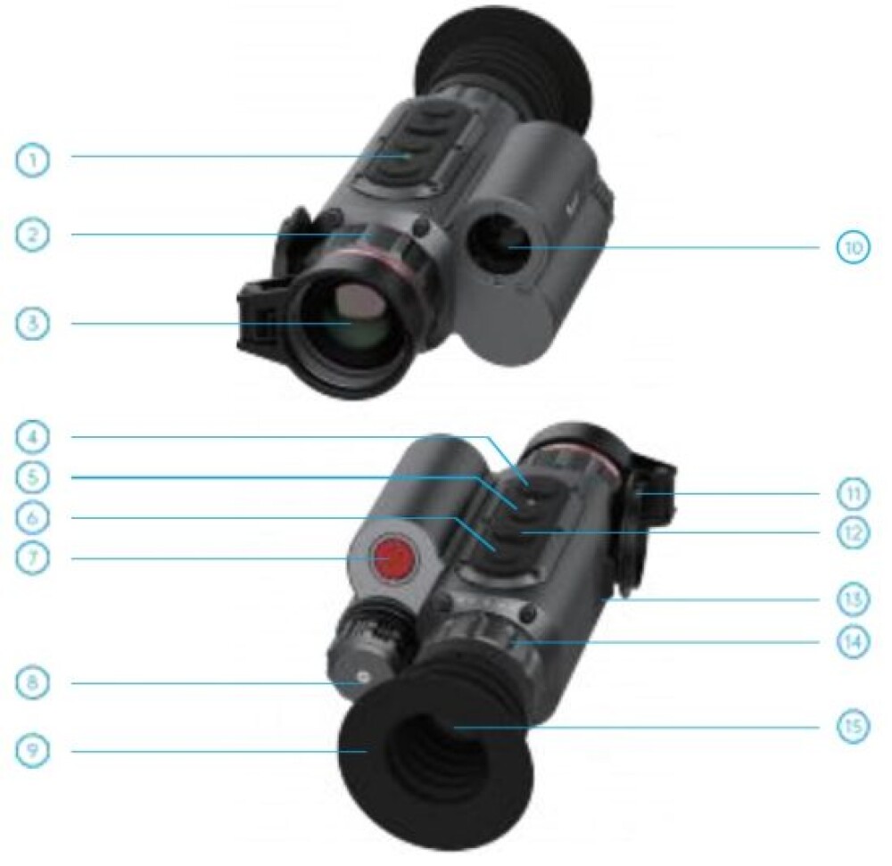 | 9. Ocular | 10. Módulo Rangeinder | 11. Tapa del objetivo | 12. Botón de menú |